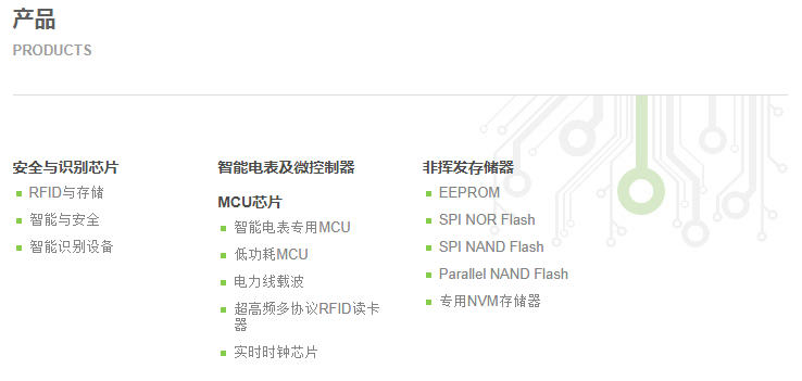 复旦微电子集团现已形成安全与识别、智能电表、非挥发存储器、智能电器四大成熟的产品线和系统解决方案,产品行销30多个国家和地区。安全与识别产品被广泛应用在金融、社保、城市公共交通、电子证照、移动支付、防伪溯源等领域,占据市场主要份额。在国家网络与信息安全的战略实施中,复旦微电子集团整合自身科研力量,在安全加密和信息数据处理等方面不断创新,取得新成果。智能电表方面,公司结合国家智能电网建设战略和物联网发展趋势,开发具有自主知识产权的核心MCU控制芯片,打破长期以来的国外垄断;非挥发存储器芯片产品线全面覆盖EEPROM、FLASH存储器系列,EEPROM市场份额居国内第一,高可靠特性FLASH存储器独具特色;智能电器产品中漏电保护芯片种类齐全、性能优越,是国内最具优势的供应商;同时,复旦微电子集团针对高可靠应用提供多种产品和解决方案。